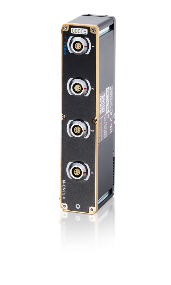 The M-CNT3 4 expands the M3 platform with a module for the precise acquisition of highly dynamic digital signals. While other modules in the series are designed for measuring analog, thermal, or electrical quantities, the M-CNT3 4 focuses on applications with high pulse density.