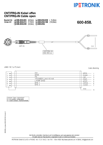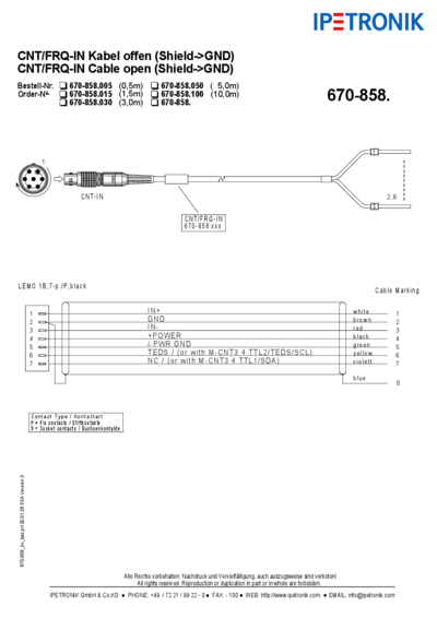Here you will find a drawing with pin assignment and circuit diagram for all IPETRONIK cable numbers.